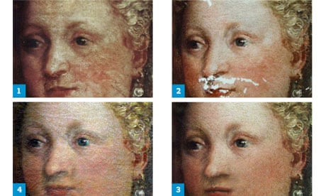 | 1) The original painting with the nose turning down. 2) Previous "repaints" are removed. 3) After the first restoration the nose and mouth have changed shape. 4) The second attempt tries to repair previous errors. Source. |